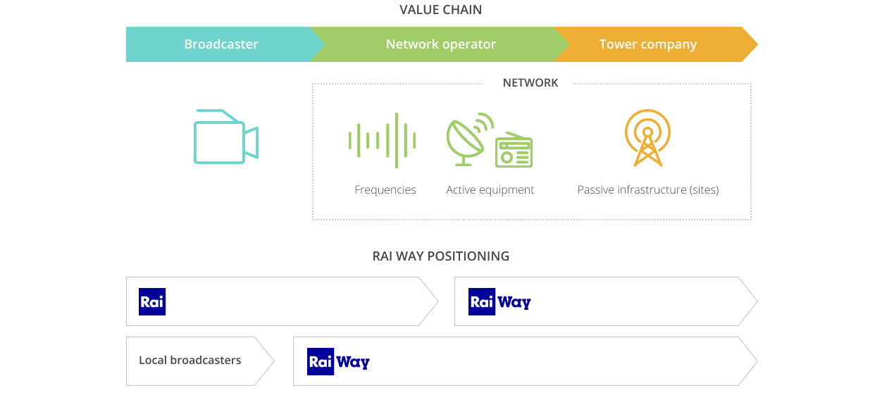 It is the sole operator of the radio and television broadcasting networks that carry the signals of RAI, whose social function of public service it guarantees by providing 99 percent population coverage on the DTT (Digital Terrestrial Television) platform.