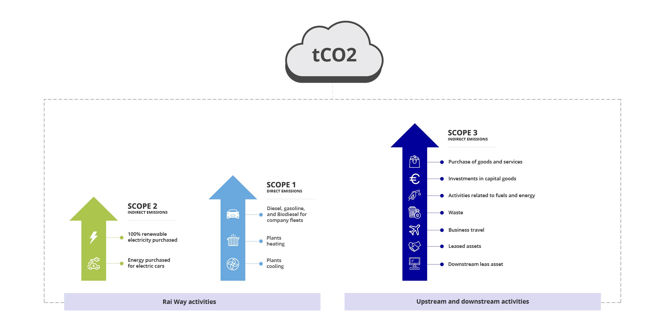 Rai Way reports its direct (Scope 1) and indirect (Scope 2 and 3) emissions through a Carbon Inventory based on the GHG Protocol standard.