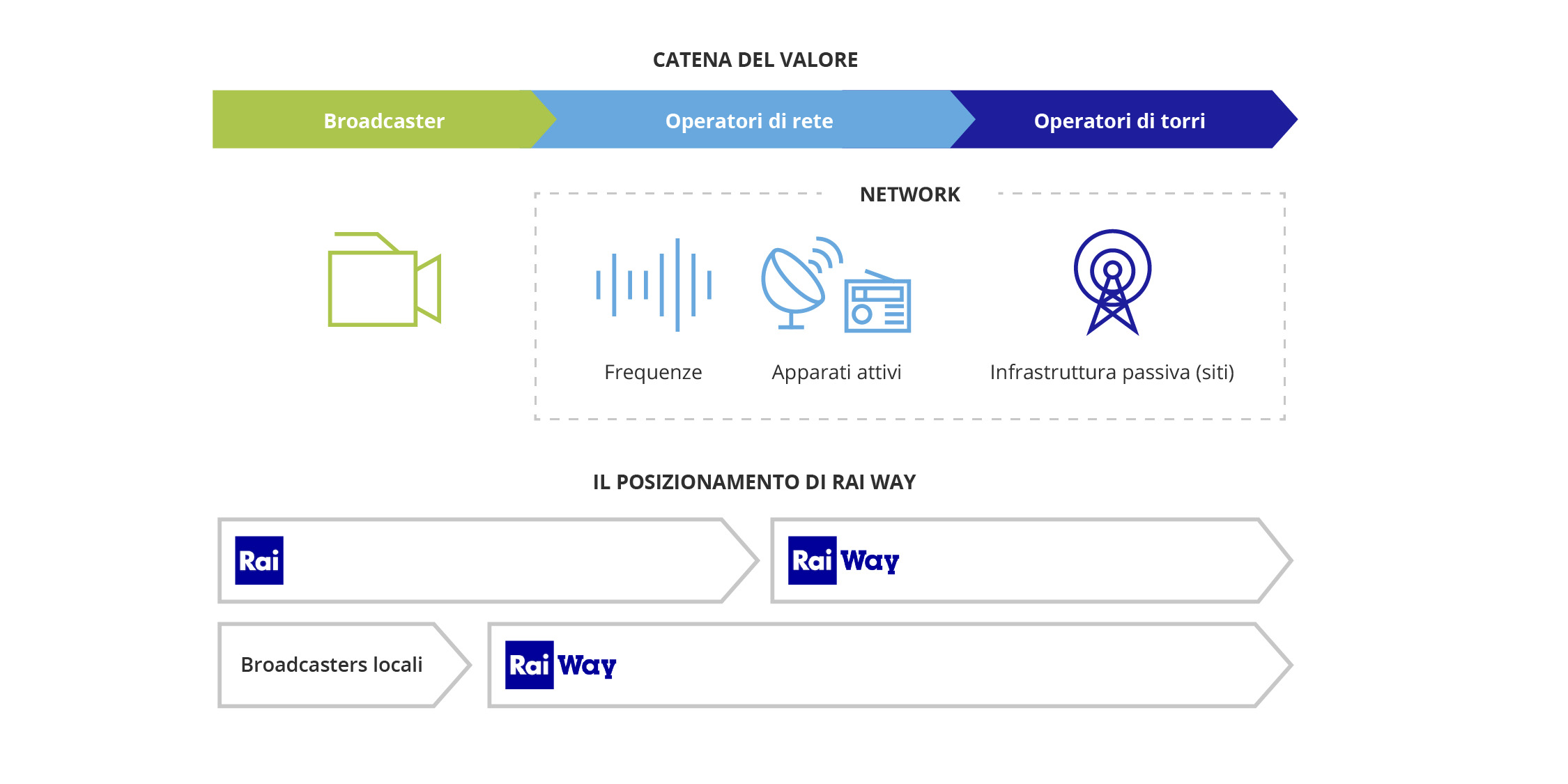 Nelle attività di broadcasting il business model di Rai Way è innovativo e distintivo: oltre a possedere le infrastrutture passive, come le torri di trasmissione, la società detiene anche gli apparati attivi installati su di esse e, per le reti regionali, le frequenze utilizzate per trasmettere i canali delle emittenti locali.