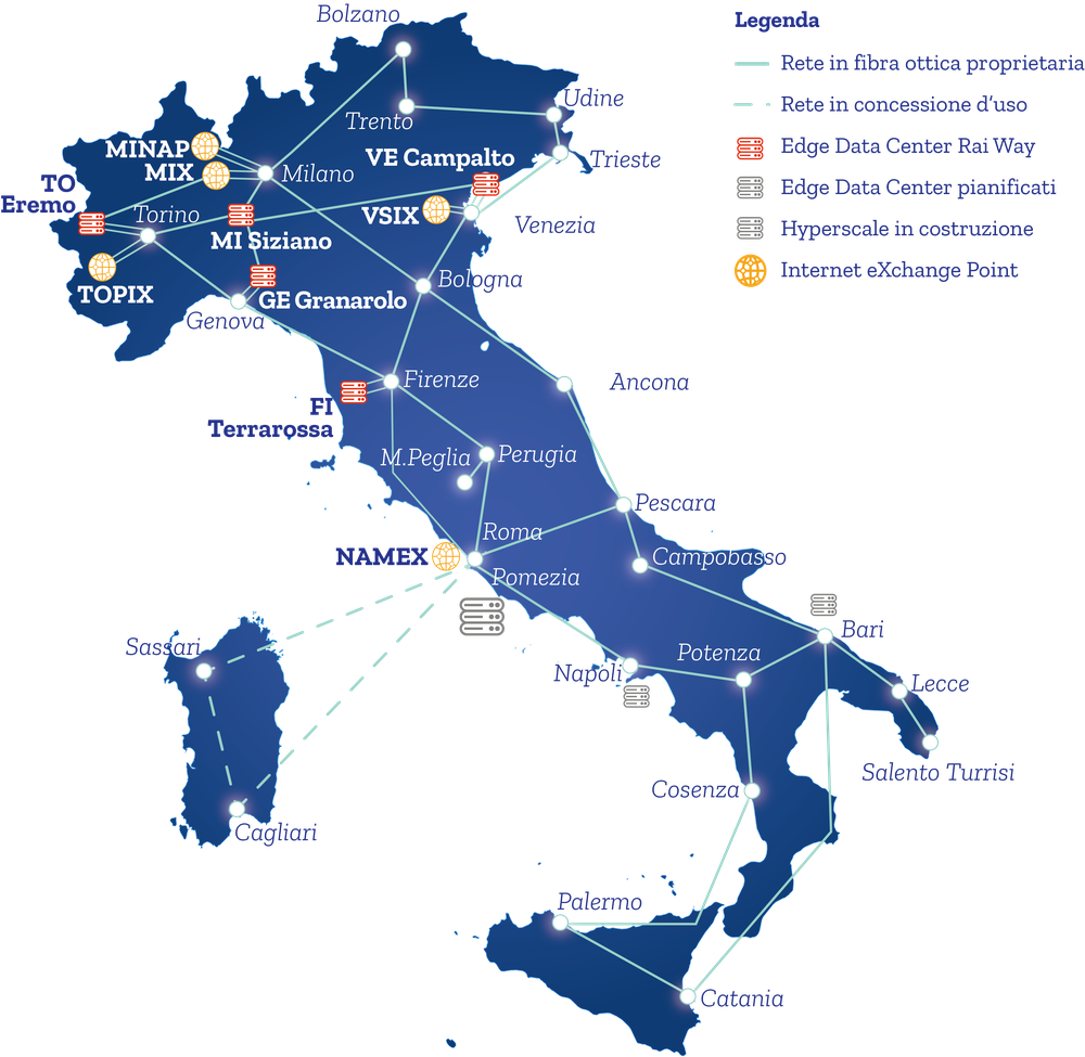 I centri sono interconnessi tramite backbone proprietario in fibra ottica e garantiscono carrier neutrality con accesso diretto ai principali Internet eXchenge Point (IXP) nazionali.
